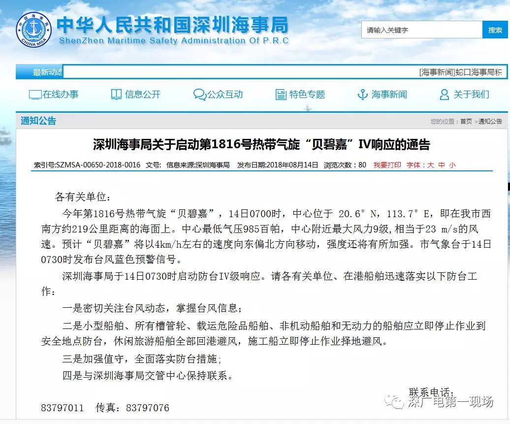 深圳海事局发布关于启动第1816号热带气旋“贝碧嘉”IV响应的通告