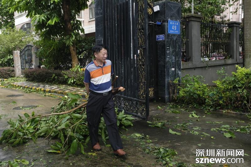 2018年9月17日10点12分,商报东二路富霖小区门口,一位市民从小区内拖出已掉落的树枝。