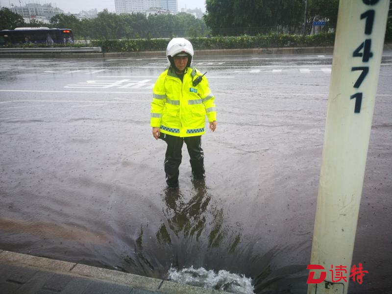 但是,眼前的情况,他们无法视而不见。深盐二通道下方,罗沙路罗湖公安分局调头口处,当艾力军经过这里时发现由于地势低洼路面已经严重积水,他们马上停下车,疏通下水道。一行人在风雨中走进机动车道,沿着路边只能用手在积水中摸索排水口的位置,将阻塞入水口的树枝树叶掏出来。但风急雨骤,道路积水水位刚下降一点,刚被清理的下水道又堵树叶、树枝等杂物堵上,他们只好不断地进行着重复的动作。而此时,台风“山竹”距离深圳接近130公里,罗湖片区测得最大阵风达16级。