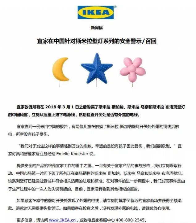 9月19日,宜家中国网站发布公告,宣布召回斯米拉(SMILA)系列3款儿童灯具(分别为斯加纳、马奈、布洛马)。