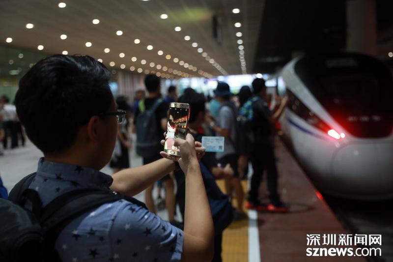 凌晨6点30分许,乘坐第一班深北至香港高铁的旅客在拍照留念
