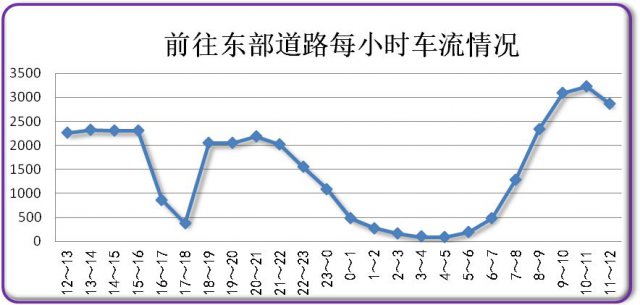今日上午8时开始,东部回程的车辆增多,9时达到峰值,约1629辆。