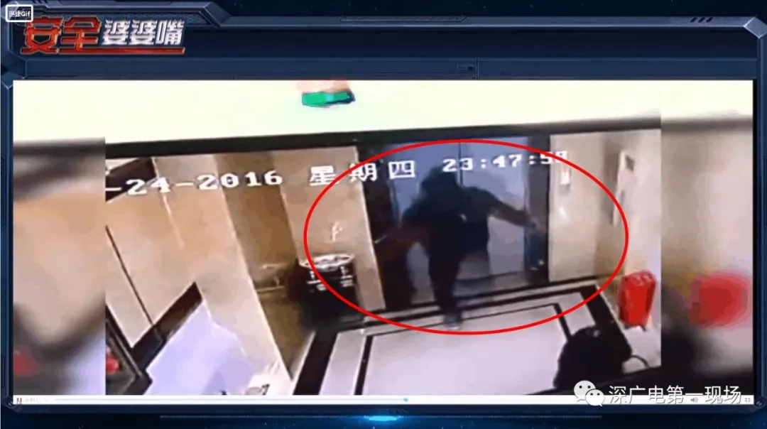 这名男子也是从远处飞奔向电梯一脚就踹开了厢门,然后不小心踏空掉下了电梯井。