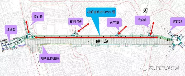 四联站位于红棉路与横岗一号路、恒心路交叉口,沿红棉路东西方向布置,为地下双层岛式车站(局部三层)。红棉路为东西向主干道,规划路宽50m,现状路宽35m,双向6车道,车流量较大。车站北侧为新城汇商场,西北侧为康乐幼儿园,西南侧为信义锦绣花园,南侧为康乐五区住宅小区,人员相对密集。