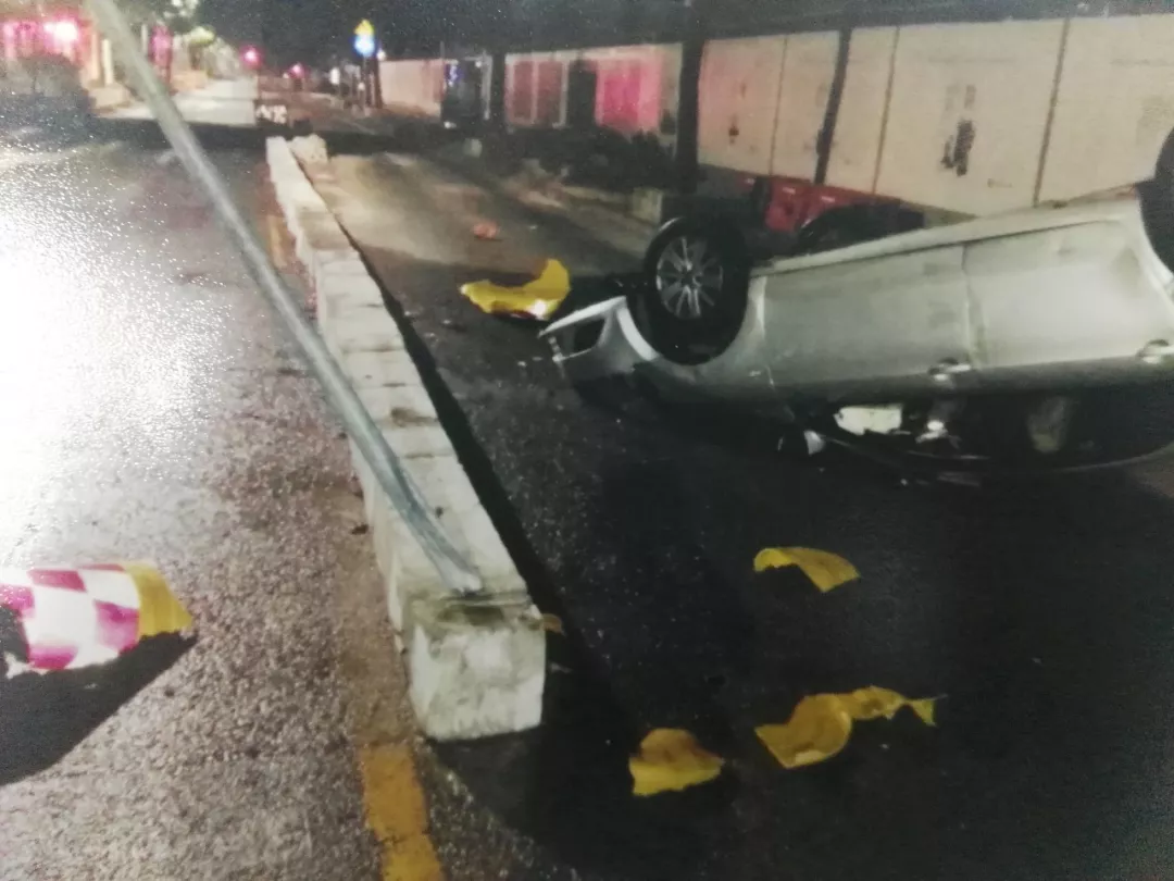 开车犯迷糊,自己撞水泥墩上,来了个底朝天
