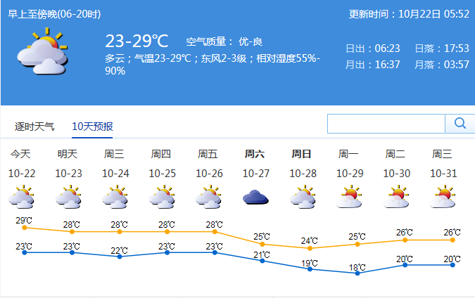 深圳新闻网讯 进入10月中旬,西太平洋上的台风们终于“安静”下来,冷空气逐渐成为接下来的主角,我国北方城市也纷纷步入秋季。尽管全市在10月11日早晨全市最低气温普遍在20℃左右,但距真正入秋还有一定距离。据市气象局预测,22日至26日我市大致多云,间中有小雨,最低气温22-24℃,最高气温27-29℃。