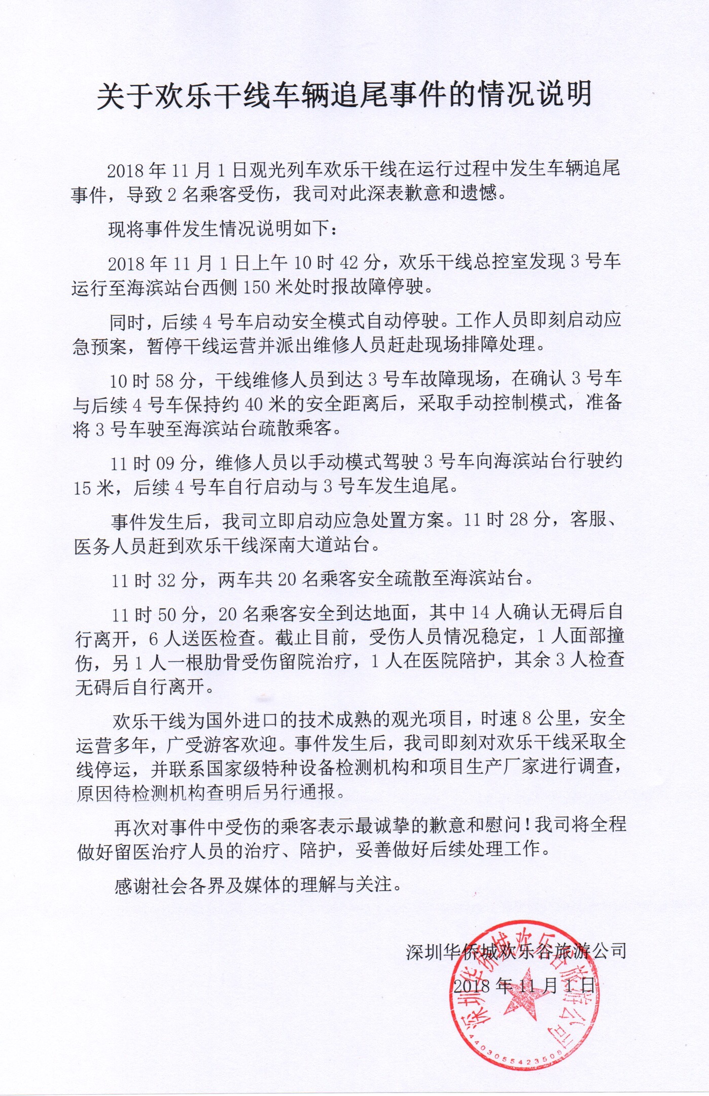 2018年11月1日观光列车欢乐干线在运行过程中发生车辆追尾事件,导致2名乘客受伤,我司对此深表歉意和遗憾。
