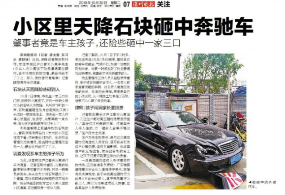 没想到,最后得知原来是自己的小孩贪玩,从一楼施工处拿走了石块,结果不小心砸了自家的车。