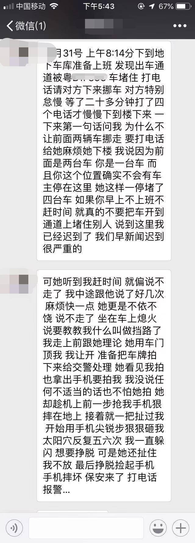 俗话说远亲不如近邻,但有的时候,同住一栋楼的业主却因一点小事而大打出手,闹得不欢而散。近日,家住南山蛇口的李小姐向记者报料,10月31日早上,因车库过道被其他车辆阻挡。她打电话请车主下楼挪车,不料手机被对方摔坏了,自己也被打伤了。