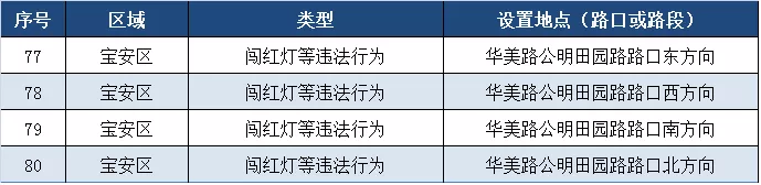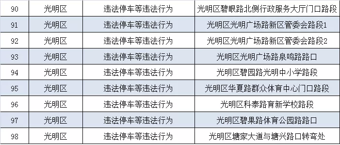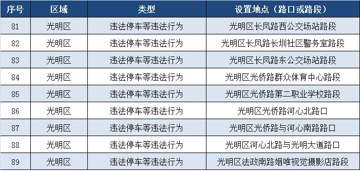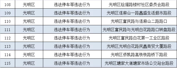 深圳新闻网11月5日讯(记者 何畅)据“深圳交警权威发布”微信公众号消息,近期深圳交警公布启用115套交通技术监控设备,重点整治违法停车、冲红灯、超速、逆行、不按车道方向行驶、占用公交车道等多种违法行为。其中福田区56套,罗湖区20套,宝安区4套,光明区35套。