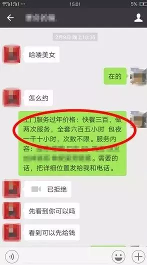 受害人看到招嫖信息主动联系时,骗子立即承诺服务内容,让受害人悠然神往,丧失理智。