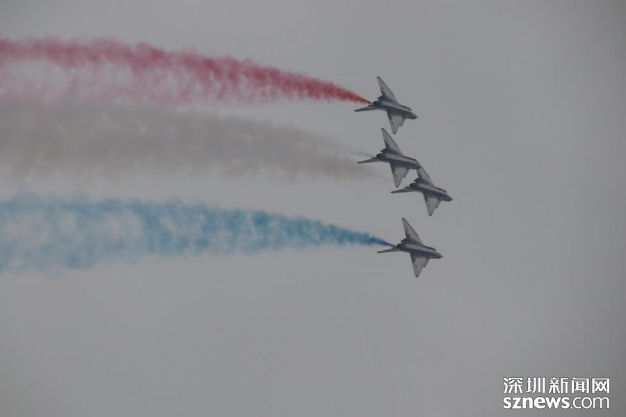 “八一”飞行表演队的队员则驾驶歼-10,展示了单机特技表演、六机编队通场……战机拉着彩烟,为观众带来精彩的空中芭蕾。