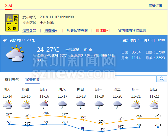深圳新闻网11月13日讯(记者 陈婕)@深圳人,温度并不高的中午,适合出去吹吹小风,散散小心,睡睡小觉。趁天气好,还可以晒晒被子!过几天天就没那么好了,距离周末的冷空气还有几天准备时间,这次不会让你们太失望,都可以准备好长袖了!