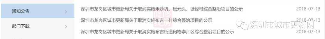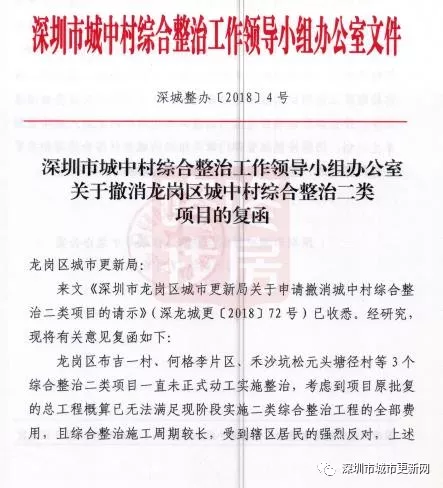 事实上,早在2018年7月,龙岗区城市更新局就已经依据相关规定要求,批复取消这几个城中村实施综合整治的申请,并予以公示。此次的批复公告实际为区城市更新局向上级城中村综合整治领导和决策机构(深城整办)的请示文件所反馈的意见复函。