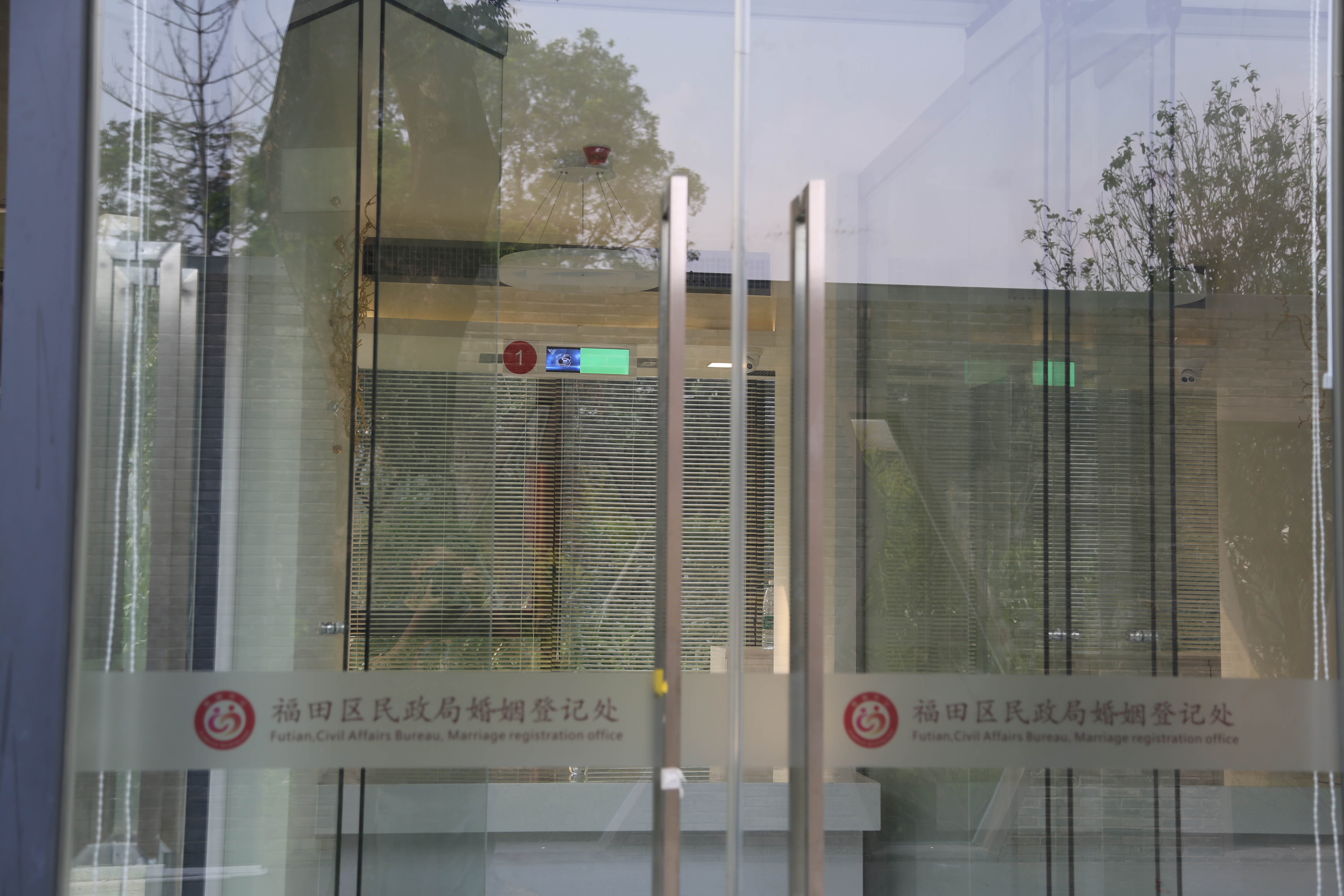 站在中式礼堂看对岸的福田区民政局婚姻登记中心叫号大厅。