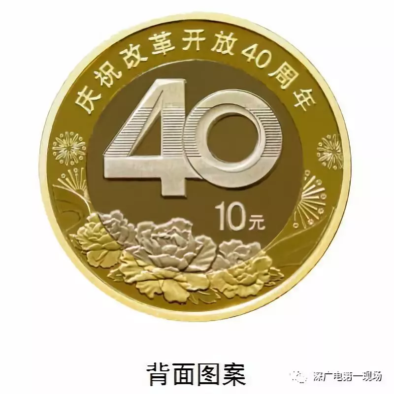 双色铜合金纪念币背面主景图案为阿拉伯数字“40”,背景图案为牡丹花、飘带和礼花。主景图案上方刊“庆祝改革开放40周年”字样,右下方刊面额“10元”字样。