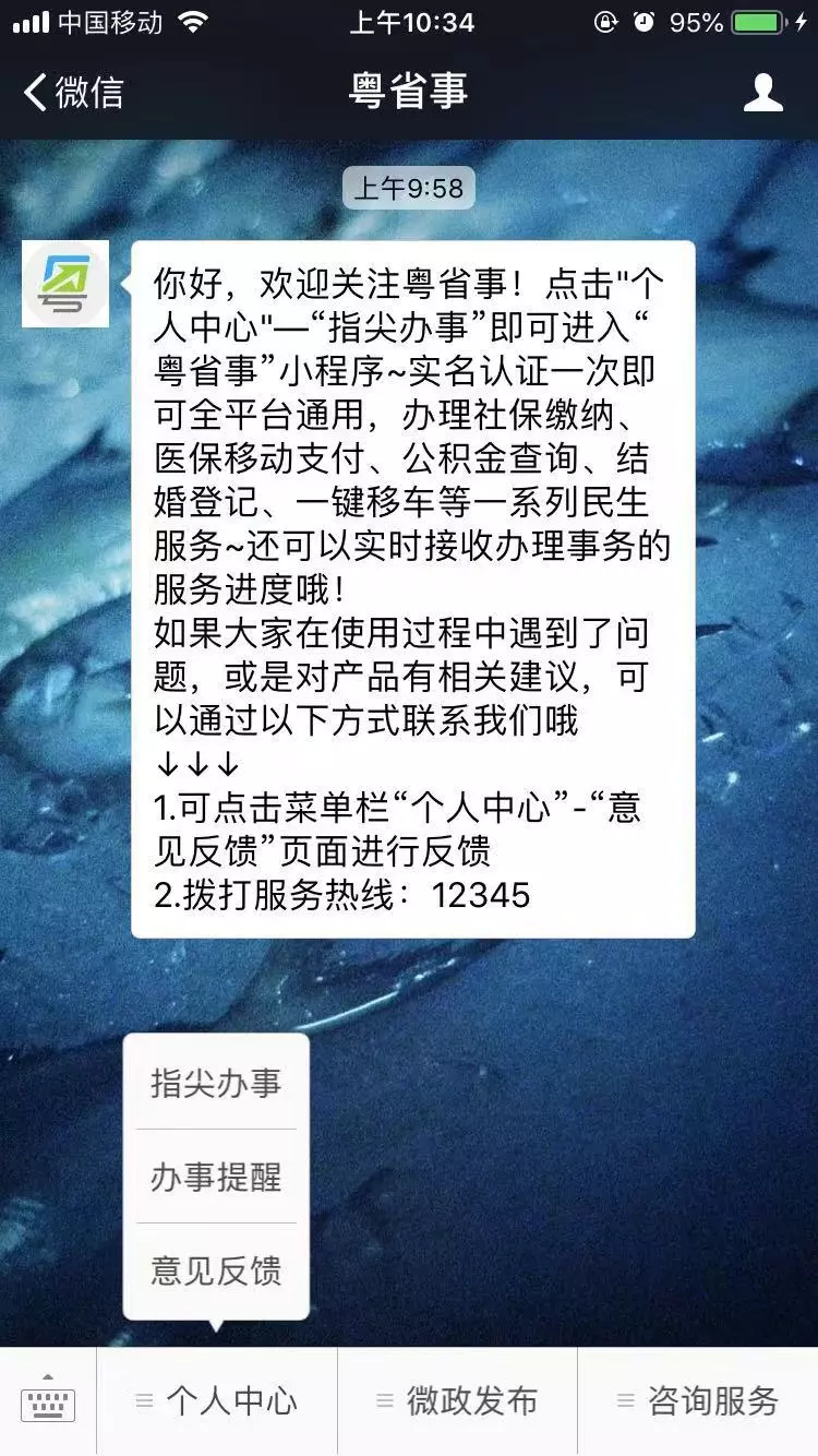 1、关注“粤省事”公众号,点击菜单栏“个人中心”-“指尖办事”