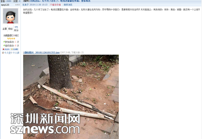 网友“syq123”发帖:台风过后,几个月了过去了,电线还暴露在外面,坐标布吉