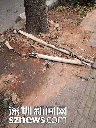 据网友“syq123”在论坛帖子上发帖称,在地铁3号线大芬站A2出口北行、中翠路与龙岗大道交口东南侧人行道绿化带上,埋在地下的线管破裂,电线裸露在外,十分危险。同时提到电线旁边倒下的大树已经扶正,但是电线依旧没有进行修理。