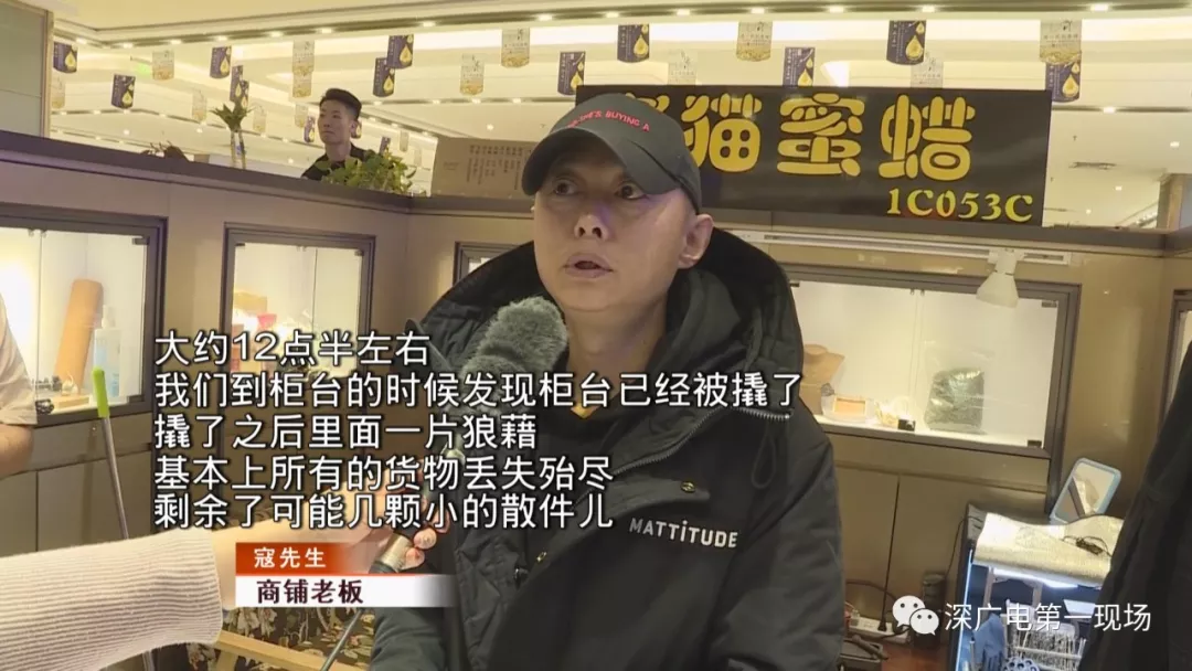 11月4日上午九点半,松岗琥珀交易市场刚开门,一名头戴黑帽,身穿黑色卫衣的男子便溜进市场,趁着早上开市人员较少,男子把一间商铺柜台里总价值280万元人民币的琥珀打包带走。