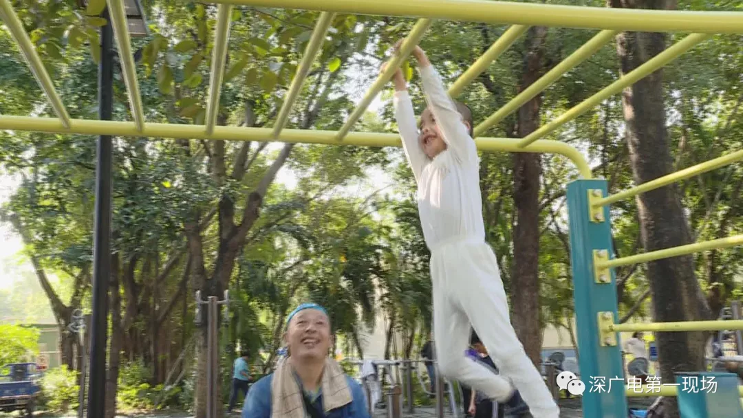 孩子的父亲袁先生则担任教练的角色,一边为儿子加油打气,一边小心翼翼地看护着孩子的安全。因为早晨已经进行了一个多小时的训练,还没缓过劲儿,晓晓在健身云梯上攀爬行走了20个来回,终于顶不住了。