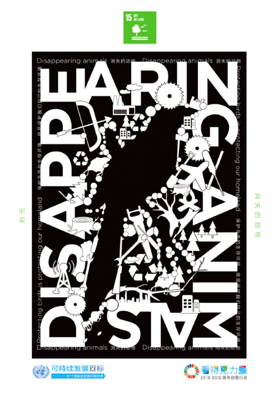作品解释 /随着工业社会的飞速发展,我们面对的环境问题越来越严重,特别是人类的伙伴-动物更是面临着各种环境问题在不断减少,作品以Disappearing animals为主题结合水、陆、空三种类型动物为代表,以生活垃圾、破坏及杀害动物等各种因素为设计元素,巧妙结合为正负图形概念来传达海报主题,黑白视觉、传达危机。