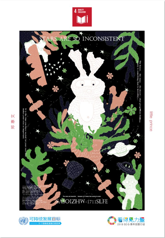 在2018年,项目以征集“SDG青年创意行动”的方式,在近3个多月的征集时间里,共收到了来自5个国家和地区的79所大学的师生以及32家机构/独立设计师参与投稿的1062件(套)作品,作品类型也不再只是平面设计,包括数字新媒体、建筑设计以及品牌策划、交互设计软件、网站搭建等多种表现形式的作品均。经知名设计师张达利、黑一烊、宋博渊、邓远健和社会创新专家冯晓近10个小时的三轮现场评审,共有1件(套)作品获得“特别大奖”,10件(套)作品获得“最佳奖”,101件(套)作品获得“优异奖”。在评选和公示期之后,获奖名单已于12月初正式发布,系列活动创意与可持续发展论坛和面向全球招募的获奖作品联合策展计划也即将开启。