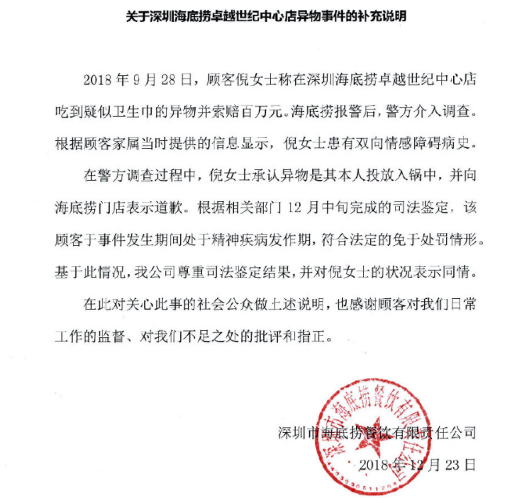 大伙儿还记得深圳海底捞福田卓越店被曝火锅有卫生巾的事儿吗?