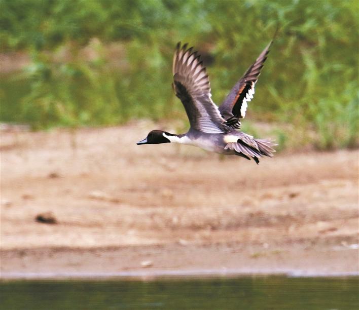 一只针尾鸭飞过3号鱼塘上空。