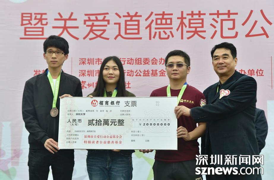 值得一提的是,在活动现场还举行了“公益金百万行”助学金捐赠仪式,为深圳大学、深圳职业技术学院、深圳信息学院三所高校各捐赠了20万元,用于资助这三所学校的困难学子。迄今深圳特区报读者公益慈善基金已资助1613名贫困大学生,累计资助金额达409万元。