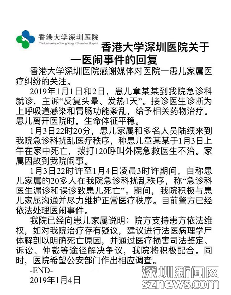 对此,港大深圳医院回应:患儿离院时生命体征平稳,支持患方依法维权