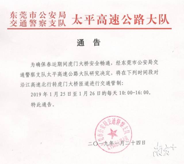 为确保春运期间虎门大桥安全畅通,经东莞市公安局交通警察支队太平高速公路大队研究决定,2019年1月25日至1月26日的每天10:00-16:00,对沿江高速北行转虎门大桥匝道进行交通管制。