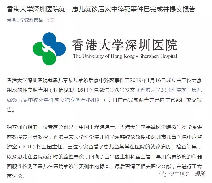 1月31日,香港大学深圳医院再次发布消息,称就患儿就诊后家中猝死事件已完成调查并提交报告。全文如下: 香港大学深圳医院就患儿章某某就诊后家中猝死事件于2019年1月16日成立由三位专家组成的独立调查组(详情见1月16日医院微信公众号发文《香港大学深圳医院就一患儿就诊后家中猝死事件成立独立调查小组》),目前已完成调查并已向主管部门提交报告。 独立调查组的三位专家分别是:中国工程院院士、香港大学李嘉诚医学院微生物学系讲座教授袁国勇教授,香港中文大学医学院儿科学系韩锦伦教授和深圳市儿童医院重症监护室(ICU)杨卫国主任。三位专家查看了患儿章某某在医院的就诊病历、检查结果,以及患儿在医院就诊时的监控录像;问询了当事医生和科室主管;再用高灵敏度的仪器回顾性检测了患儿在医院就诊当天剩余的标本,最后查询了相关医学文献,并进行了专家讨论。 三位专家已出具了最终调查报告。报告确定了患儿感染的类型,分析了患儿猝死的原因很可能为心源性并发症,并为今后避免类似事件再次发生提供了建议。报告指出医院的诊疗过程符合专业规范。 2019年1月25日上午,医院已将报告的内容悉数告知患儿章某某家长,并对家长进行了慰问。同日,医院也将报告上报给了主管部门。 由于报告的部分内容涉及患儿及其家人隐私,以及报告的部分内容依据《中华人民共和国传染病防治法》规定,医院没有权限向公众公开,所以医院无法公布报告全文。 医院一直秉持公开、专业、科学的方式处理这一个案,寻求真相,并依此对诊疗工作进行持续改进,促进医学的进步。医院也正在等待第三方的尸检结果。 最后,医院对独立调查组的三位专家致以诚挚的谢意,感谢他们在短短数天时间内,认真、细致、严谨地完成了调查,并撰写了报告。 香港大学深圳医院 2019年1月31日