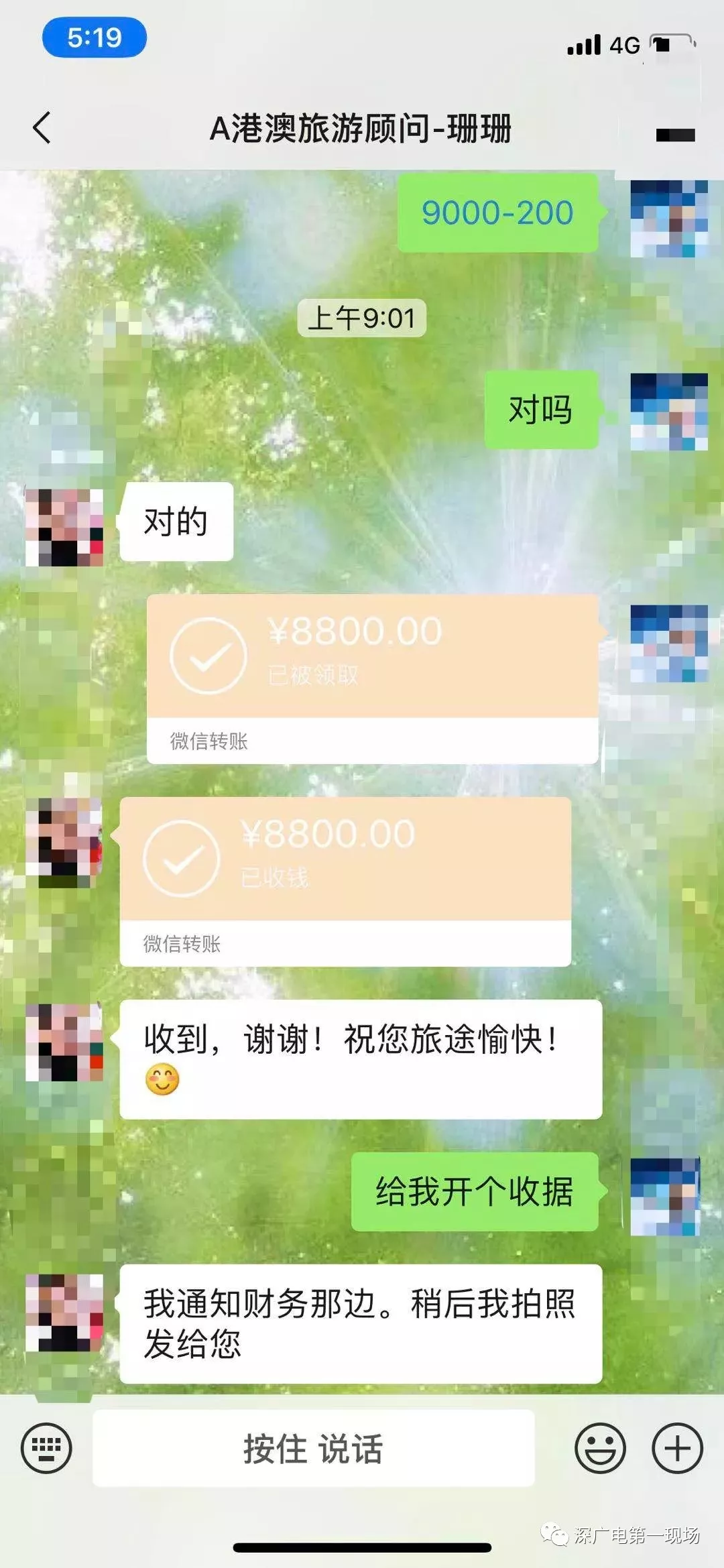 8号上午,记者先后用电话、微信等方式联系上了,刚躲进香港海港城马哥孛罗酒店的李女士。她说,1月31日通过百度搜索“港澳游”,与深圳北方大厦7楼的国旅,微信名叫“珊珊”的旅游顾问联系,在支付了200元定金后,于2月6日,从北京飞抵深圳入住了“珊珊”安排的鹏威酒店,并与“珊珊”的同事签订了合同。李女士夫妇和他们的孩子以及父母5人,以平均1800元的团费价格,参加25-30人的5天4晚精品豪华团,赴香港澳门游玩,精品团豪华的内容是无购物、住“四星”的香港君逸酒店。2月7日上午,他们就从口岸过关到了香港。