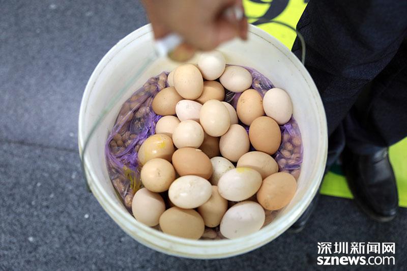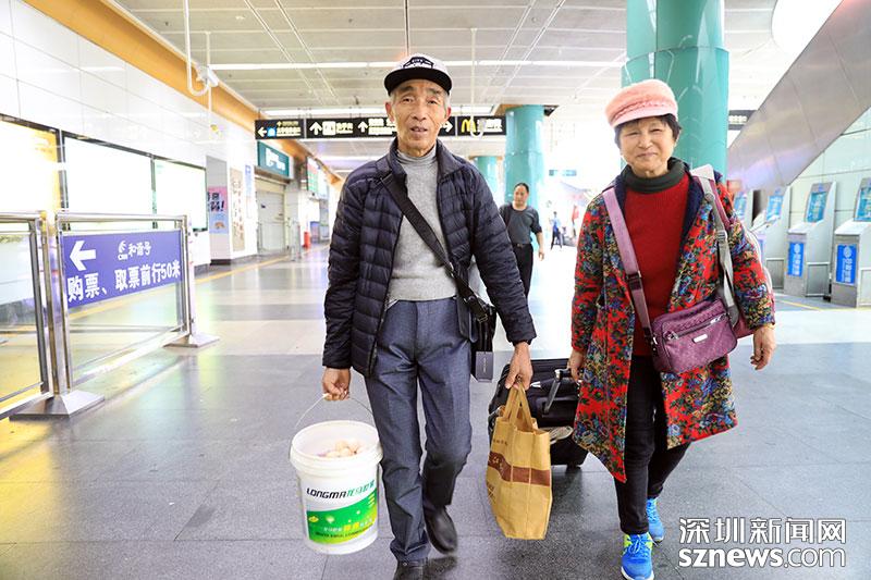 老家益阳的徐爷爷此次返深,从家里带了鸡蛋还有家乡的花生,满满装了一大桶