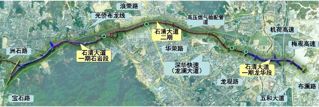 一期工程建设福龙路与深华快速路的T型立交,以解决龙华与光明、福田、南山、罗湖的交通转换,包含部分主线、地面辅道、6条匝道,主线长585米。