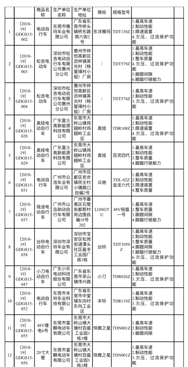 南方网2019年2月14日讯 2月13日,广东省市场监督管理局发布2018年度流通领域电动自行车(含电池和充电器)商品质量抽查检验结果,60款电动自行车(含充电器)监督总体不合格。其中,电动自行车31款不合格,电动自行车充电器29款不合格,爱玛、台铃、东洋雅玛、奥娃等品牌纷纷上榜。