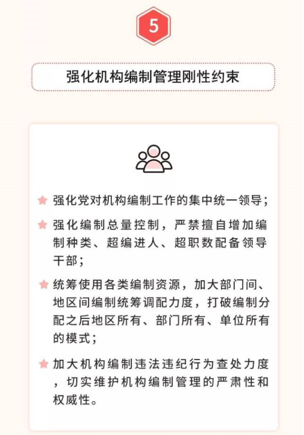 五是全面落实优化协同高效原则。坚持一件事情原则上由一个部门负责,把理顺职责放在重要位置,从有利于突出主业、有利于服务管理的角度出发,实事求是,科学设置党委和政府机构,宜大则大、宜小则小,该加强的加强、该精简的精简、该优化的优化,实现机构职责的深度融合。
