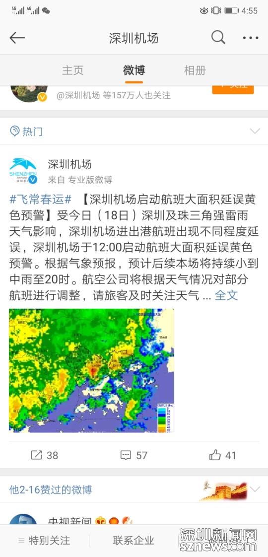 深圳新闻网2月18日讯(记者 涂胜)记者从深圳机场获悉,受今日(18日)深圳及珠三角强雷雨天气影响,深圳机场进出港航班出现不同程度延误,深圳机场于12:00启动航班大面积延误黄色预警。