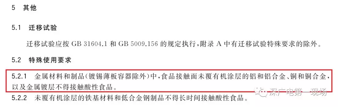 根据《食品安全国家标准食品接触用金属材料及制品》(GB4806.9-2016)规定,“金属材料和制品(镀锡薄板容器除外)中,食品接触面未覆有机涂层的铝和铝合金、铜和铜合金,以及金属镀层不得接触酸性食品。”