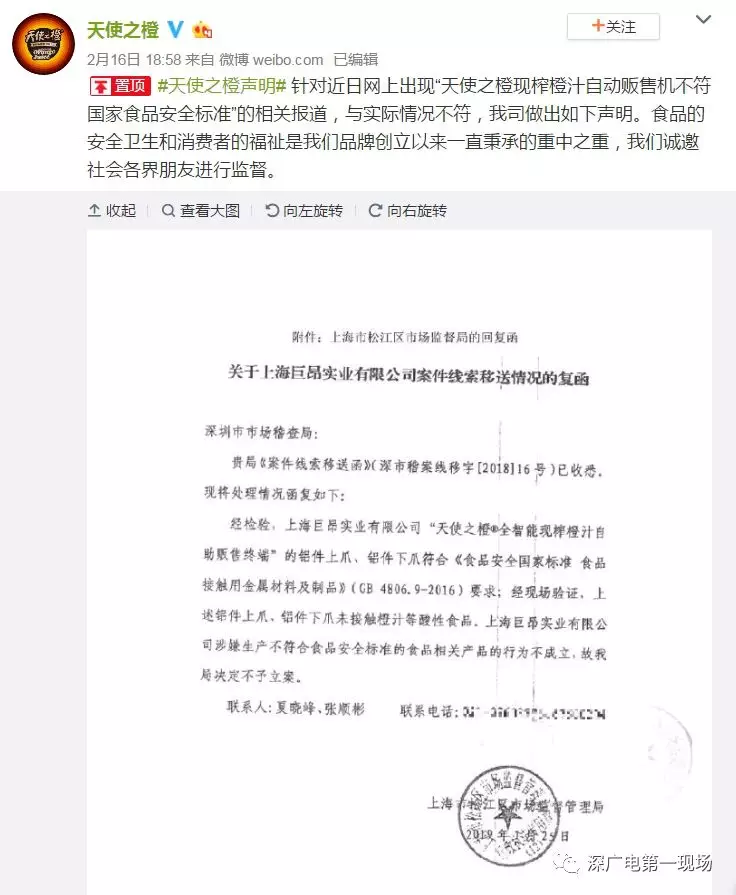 今天下午,深圳市市场稽查局出具书面回应,通报了相关情况:
