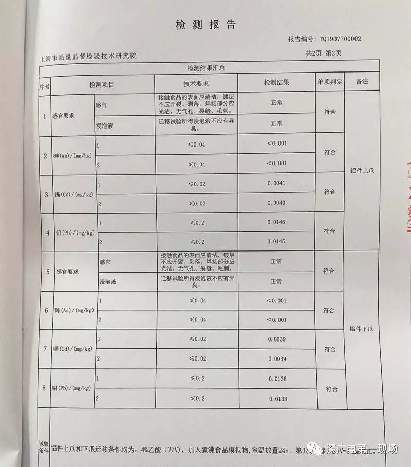 在现场,松江区市场监管局还向记者出示了一份该局抽样后委托上海市质检院进行检测的检测报告,检测对象是“天使之橙”现榨橙汁机的上下爪,检测依据就是上述的我国国家标准《食品接触用金属材料及制品》。经检测,相关部件的检测项目均符合上述标准。
