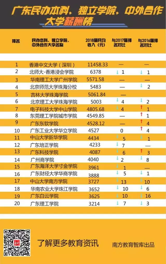 ▲广东民办本科、独立学院、中外合作大学薪酬20强,港中文(深圳)成全省首个平均月薪过万高校。