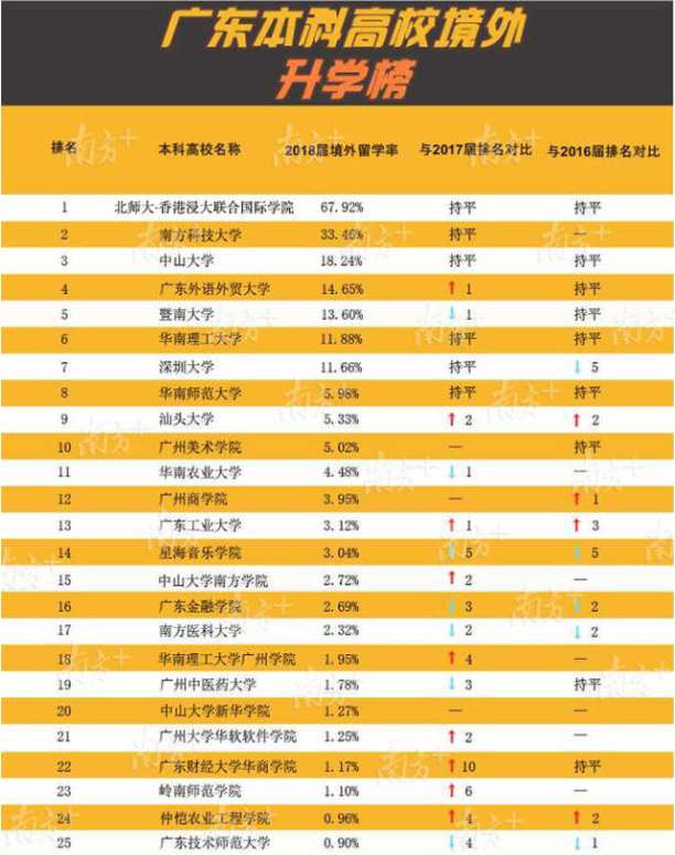 广东外语外贸大学境外留学人数显著提升,2018届共有275人升入世界排名前100名的高校深造。两所内地与香港合作创办的大学在境外留学率上处于全省前列。北京师范大学-香港浸会大学联合国际学院持续多年保持全省第1位,此次共有811人留学,其中481人就读世界前100名的大学。香港中文大学(深圳)仅公布总升学率65.67%,该校就业处相关负责人介绍,升学率中绝大部分是境外留学,176名学生平均每人收到3份世界知名大学录取通知书。