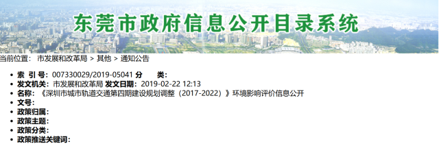 南方+客户端2019年2月24日讯 2月22日,东莞市发展和改革局在其官网发布了《深圳市城市轨道交通第四期建设规划调整(2017-2022)》环境影响评价信息公开。该通知指出,“深圳市发展和改革委员会已组织相关单位完成《深圳市城市轨道交通第四期建设规划调整(2017-2022)环境影响报告书(征求意见稿)》。由于深圳10号线东延途经东莞市凤岗镇,现将相关信息进行公开,并征求公众意见。”