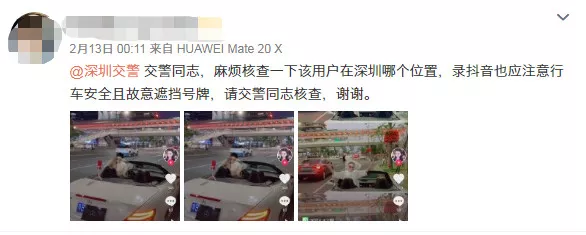 2月13日凌晨,深圳交警接到一名网友举报,称有人在路边拍视频还遮挡号牌。