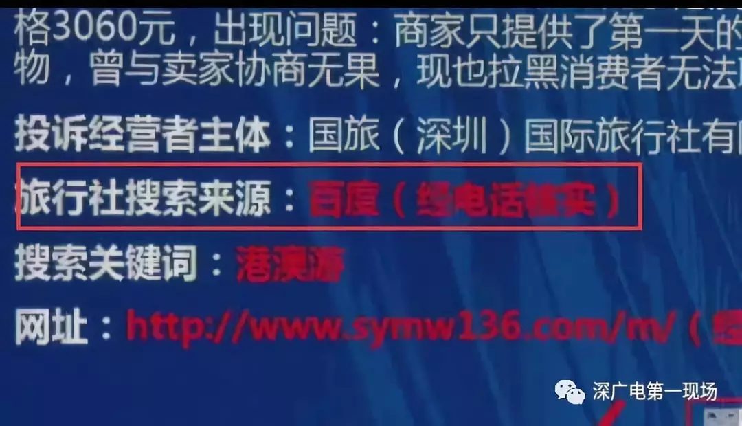 深圳市消委会调查发现,搜素“港澳游”、“国旅”等关键词时,搜索页面会出现加V等级认证的旅行社广告信息,但经核实,“深圳信用网”商事主体登记信息中并无该企业。