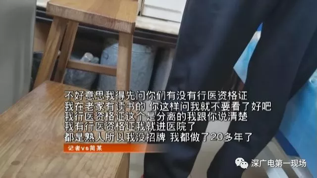 简某的名片上,印着他是医学院毕业,有20多年治疗经验,他的治疗对骨折脱位通风腰突症有特效,甚至半身不遂后遗症都可以治。名片上,简某有两个营业点,分别在龙岗坂田和布吉。但地址只显示大范围,没有房号。原来,找他看病,先得电话预约,然后他才告诉你具体房号。昨天,记者想办法预约到简某,他说可以在坂田五和路附近的吉丰楼给记者看病。记者来到现场,看到楼下没有任何标识,不过电梯里有块不大的牌子,写着“跌打骨伤”电话号码和门铃0305字样。