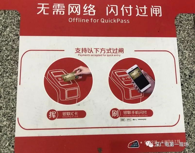 记者了解到,深圳市地铁已全面受理金融IC卡及银联闪付,金融IC卡指的是各银行发行的印有银联标识及闪付“QuickPass”标识的芯片银行卡(包括借记卡和信用卡);银联闪付支持HuaweiPay、ApplePay、SamsungPay、MiPay等各种手机Pay,消费者无需解锁手机和打开APP,即可完成支付。市民在地铁站内贴有“银联闪付”、“全国交通一卡通”标识的闸机前,便可直接用金融IC卡、手机刷卡进出站,也可在无网络的条件下直接用于地铁过闸。
