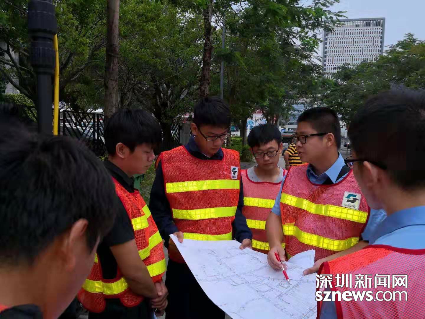 图为王经波(后左一)和他的团队完成排水口排查后